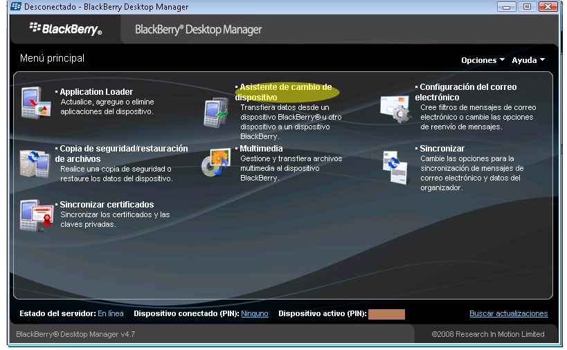Desde el dispositivo, pulsamos la tecla de blackberry y nos vamos a configuración
